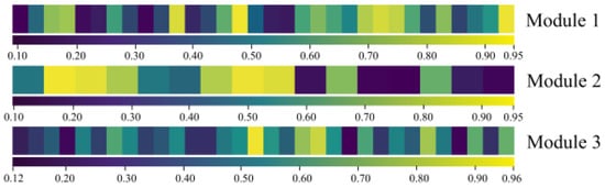 To analyze the proposed attention mechanism, the weight vectors output from the three attention modules in the feature fusion layer are visualized in Figure 11, where the attention weight maps are arranged horizontally in channel order, and the different weights are displayed in different colors. The visualization of the weights reveals the weight values of channels vary from 0.10 to 0.96. These results indicate that the proposed attention mechanism can achieve feature information selection by suppressing irrelevant features. The observations also demonstrate that, even after sensor data filtering, the attention mechanism suppresses information from more than half of the channels, and the weights of approximately one-quarter of the channels were concentrated around 0.1, thereby exhibiting a significant suppression effect. In addition, due to the parameter-sharing nature of the convolution operation, the information between the neighboring channels may be highly correlated. However, the visualization results show significant weight differences, even among adjacent channels, indicating that the proposed mechanism accurately captures channel information and assigns appropriate weights.