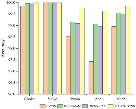 Figure 12 shows that the 1DCNN-IAM and 1DCNN-CAM methods obtained better fault diagnosis performance compared to the 1DCNN method, which indicates that the IAM and CAM can optimize the features based on the importance and correlation information of the channels, and this improved the accuracy of fault diagnosis. Note that the MA-MS1DCNN, which integrates two attention modules, exhibited optimal performance in all diagnostic tasks. These results suggest that fusing different levels of information in the process of constructing the channel attention can enrich and deepen the feature characterization and further improve the effectiveness of the feature extraction process.