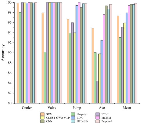 To verify the superior performance of the proposed method, it was compared with eight existing methods (the SVM [36], Shapelet [6], ETSC [37], CLUST-GWO-MLP [23], LDA [6], MCIFM [38], CNN [21], and HEDNN [22] methods) on the same experimental dataset. The SVM is a classical shallow machine learning algorithm that is frequently used as a classifier. Shapelet transformation converts time-series data to distance data and then performs fault classification. ETSC is an early classification algorithm specialized for time-series data that enables classification decisions before the time-series data are fully observed. CLUST-GWO-MLP uses unsupervised clustering (CLUST) to group features to reduce complexity and supervised learning via optimized multilayer perceptron neural networks (GWO-MLP) to classify faults. LDA reduces the dimensionality of manually selected high-dimensional features to a low-dimensional discriminant space to realize fault classification. Note that the structures of the CNN and MCIFM methods are similar in that they both adopt a parallel network structure. The difference is that the CNN method uses multiple 1DCNNs with different receptive fields in the feature extraction stage. HEDNNs use a bagging strategy to integrate different DNNs for robust diagnostic results. To reduce the influence of randomness, the above methods were evaluated over 10 repeated experiments, and the average accuracy was considered as the final result. The corresponding results are shown in Table 8.