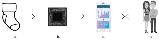 It is widely acknowledged that there is a paucity of products available for monitoring infants and young children. The majority of these products are related to high-definition cameras and lack the functionality to closely monitor the various physiological data of infants and young children. It is notable that products related to clothing are particularly scarce. The design and operational principle of anti-suffocation socks for infants and young children are comparatively intricate in comparison to existing products on the market. The design and working principle process of anti-suffocation socks for infants and young children has been proposed by researchers and is illustrated in Figure 2. In particular, the overall working principle process is divided into four modules, which are carried out in sequence. Module a comprises a baby sock that is attached to a monitoring sensor and can be worn on the feet of infants for 24 h. Module b is a monitoring sensor module that includes monitoring of blood oxygen saturation, temperature, and heart rate. When the three physiological indicators of infants and young children change, the Bluetooth component of the monitoring sensor transmits the data to the mobile phone. Module c is a mobile application for parents that receives information from module B for algorithm analysis and detection. Module d allows parents to immediately ascertain whether they hear an alarm message while sleeping and provide emergency treatment according to the first aid measures in the application based on the actual situation. In severe cases, they can be immediately conveyed to a hospital for treatment.