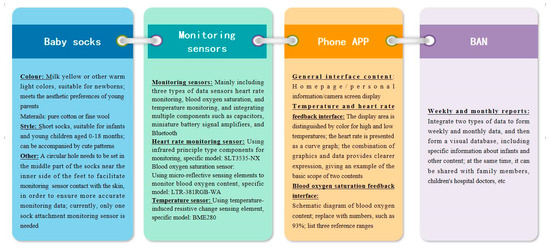 Based on the proposed work design principles and process, the researchers drew a design concept framework for anti-suffocation socks for infants and toddlers, as shown in Figure 3. The overall framework is continuous, i.e., sequential modular content, including four modules: baby socks, monitoring sensors, mobile apps, and body area networks.