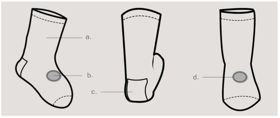Functional Design of Wearable Technology. As shown in Figure 4, the schematic diagram depicts the flat structure of infant and toddler socks. In particular, Module a refers to the body of the sock. In view of the distinctive attributes of infants and toddlers and the necessity for monitoring sensors, a medium-to-short sock style is employed, featuring a tightening design at the foot opening and toes. Additionally, the fabric is elastic throughout, facilitating the adhesion of the transparent monitoring ring at the base of the monitoring sensor to the skin, thereby ensuring more precise monitoring data. Module b represents the location of the monitoring sensor. The researchers selected this point on the back of the foot for two primary reasons. Initially, they consulted with relevant medical professionals at the Affiliated Hospital of Shandong University of Traditional Chinese Medicine. The infants and toddlers are too young, and their fingers and toes are too small, resulting in inaccurate measurements. Accordingly, the most appropriate locations are the palm, dorsum of the foot, and forearm, which possess a substantial surface area, numerous blood vessels, high transparency, and are readily amenable to the acquisition of precise data. Another source of reference is the article “Comparison of Results of Percutaneous Blood Oxygen Saturation Monitoring in Different Parts of Newborns”, published by Feng Yanhua et al. [10], in which experimental data show that the best positions for monitoring blood oxygen saturation in infants and young children are the dorsum of the foot, the palm of the hand, and the forearm; therefore, the researchers comprehensively designed the main body and selected the dorsum of the foot position as the monitoring point for blood oxygen saturation. Module c is the patch pattern on the heel of the foot, which makes the shape of the sock not monotonous and adds fun.Module d is a sandwich fabric close to the skin, also in soft cotton, for added strength support at the opening.