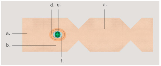 To more accurately and clearly express the connection between the baby socks and monitoring sensors, the researchers constructed a flat paper pattern structure unfolding diagram, as shown in Figure 6. Specifically, the unfolded diagram is a paper pattern structure diagram of the socks. The production of the socks is completed in a single operation using a fully formed horizontal knitting machine, eliminating the need for a paper pattern structure. The researchers drew the diagram to better describe the relationship between the socks and monitoring sensors: Module a is the toe part of the socks, Module b is the back part of the socks, and Module c is the sole part of the socks. At the same time, the diagram also shows the schematic diagram inside the socks, which includes the bottom of the monitoring sensor inside the socks. Module d is a sandwich fabric close to the skin, which is also a soft pure cotton fabric to increase the strength support at the opening. Module f is a lamination used to close the transparent optical monitoring shell, which permits the monitoring sensor to sense through the socks. Additionally, the lamination can clamp surrounding fabric of an identical size to the lamination contour for fixation. Module e is a transparent optical monitoring shell of an identical size to the opening of the socks. It is imperative that the shell is in close contact with the skin, yet it must not exert any compression on the skin of infants and young children.