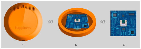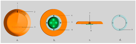 Monitoring sensor design. The researchers drew a multi-view decomposition module, as shown in Figure 7, which shows the external composition decomposition of the monitoring sensor, including four parts: front view, top view, left view, and composite view. The entire monitoring sensor is designed in a circular shape, with an overall colour from the Morandi colour system. The main colour of the sensor is orange, supplemented by grey blue. The overall design size data are a diameter of 3.6 cm, height of 1 cm, and weight of 126 g, which meet the size matching requirements of baby socks. Specifically, As shown in Figure 7, Module a is the front view of the monitoring sensor and also the top view of the sensor, and Module—1 is the working breathing light. When the monitoring sensor is connected via Bluetooth to the phone, it will work automatically. At this time, the green light will light up, and when the green light turns into a blue light, this indicates that the battery is low and needs to be charged in a timely manner. When the green light turns red, it indicates that the baby’s three physiological datapoints have changed and are not within the normal standard range, which requires timely treatment. At the same time, the mobile app will also sound a warning. Module—2 is a heat dissipation hole, and the sensor is equipped with multiple sensing elements and a miniature lithium battery. During long-term monitoring, a small amount of heat is generated to prevent harm to babies and young children, and also to reduce the effect of heat on the sensing elements. Module—3 is the name of the monitoring sensor and also the name of the mobile app, which is called Happiness in English and Happiness Hao in Chinese. The specific meaning is as follows: the health of infants and young children is the greatest happiness of parents. The function of the monitoring sensor is to provide warnings and reminders as the implicit translation of “Hao”. Module b is the top view of the monitoring sensor and also the bottom view of the sensor. Module b—4 is a composite attached to the monitoring sensor, which is used to attach and fix the monitoring sensor with another composite d; Module b—5 is a transparent optical monitoring shell, which is an important part of the sensor shell. Its permeability and refractive index can provide a window for the red and green light emitted by the blood oxygen saturation sensor and heart rate sensor, increase the refractive index, and facilitate real-time monitoring of two physiological conditions through the skin. The bowl shape has a slope to increase the divergence of light. Module b—6 is the fixing hole on the lamination. Module c is the left view of the monitoring sensor, where Module c—7 is the charging port of the monitoring sensor, which is a micro-USB interface type. At present, only this type is available, and the iOS charging port will be upgraded in the future. Module c—8 is a side view of the transparent optical monitoring shell, which shows that there are not many protruding parts and the shape is flat, which minimises the impact of the monitoring sensor on the skin of infants and young children. Module d is the lamination used to attach the monitoring sensor, and Module d—9 is the protruding part of the lamination used to close the opening and closing plate 4 attached to the sensor in Module b.