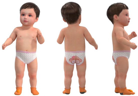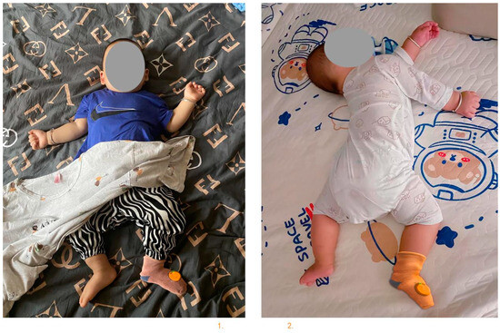 Figure 13 is a schematic diagram of the specimen made by the researcher and photographed for illustration. It shows only the front and side views. Due to the influence of ambient light, the colour of the sock body may change slightly from the colour shown in Figure 14 and the colour photographed after the baby wears it (Figure 14), but this does not affect the actual effect of the functional test.