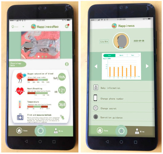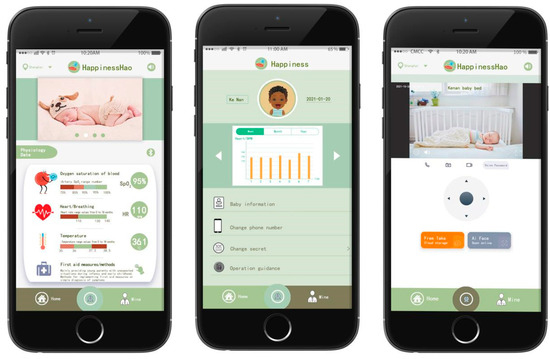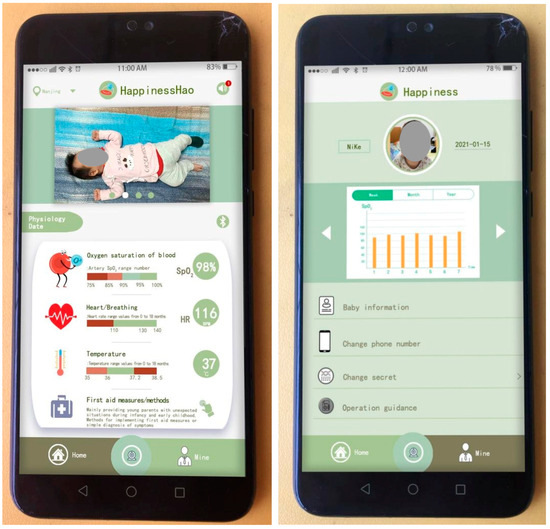 The following section will address the design of the user interface of the mobile application, which represents the most crucial aspect of the design process. This section will be divided into three subsections: the home interface, the section dedicated to personal information, and the camera screen. As shown in Figure 12, the diagram on the left depicts the home interface, which is subdivided into four modules: the top title bar, photo wall, physiological data, and bottom taskbar. The top title bar encompasses the address location, logo, and sound buttons. The function of the sound button is to emit an audible signal when the infant’s physiological monitoring data fall below the established threshold. Concurrently, a unique message is transmitted to the mobile application, comprising the time and the values of the physiological data that have undergone a change. The photo wall module provides a space for young parents to upload images of their infants and toddlers, thereby enhancing the app’s specificity and interactivity. The four images can be disseminated in real time. The physiological data module incorporates Bluetooth functionality and enables the real-time monitoring and display of three physiological parameters. In particular, the Bluetooth module oversees the operation of the monitoring sensor. Upon enabling Bluetooth, the monitoring sensor initiates a connection and commences its operational cycle. Conversely, in the event of a disconnection, the monitoring sensor will cease operation. In the physiological data monitoring module, the initial step is the measurement of blood oxygen saturation. The symbol used to represent blood oxygen saturation effectively conveys the fundamental physiological principle underlying the monitoring of this parameter. Infants and young children constitute a distinct demographic, with a typical range of blood oxygen saturation values between 90% and 100%. However, in order to reflect the warning design prompt, in this application, when the blood oxygen saturation is between 90% and 95%, an automatic alarm is triggered, prompting parents to regularly observe the infant’s condition. It should be noted that at this saturation level, the risk of suffocation is minimal. The blood oxygen saturation value is monitored in real time and transmitted, and the magnitude of the value also corresponds to the range of SpO2 values. Heart rate monitoring is also very important physiological information. The green area in the graph represents the normal range of heart rate values for babies and young children, which is 110 BPM–140 BPM. However, the heart rate of babies and young children is higher than that of adults, mainly due to their faster metabolism. At the same time, the values obtained are displayed in real time. Previous researchers have explained that the age range of babies and young children we are targeting is around 0–18 months, and the normal range for determining blood oxygen saturation and heart rate is also the same. The range of 36 °C–37.2 °C is the normal temperature for babies and young children, and any temperature above or below this range is abnormal, at which point parents need to check urgently and seek treatment.