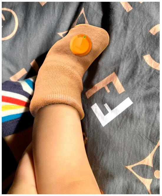 Test procedure: Due to the epidemic, the researchers sent the samples to the parents of two infants and two toddlers for online guidance and consultation on their functional experience. The parents of the babies and toddlers need to fully charge the monitoring sensor the night before the test. After the baby has fallen asleep, the parents should put socks on the baby’s feet and position the sensor at the top of the instep as shown in Figure 15, turn on Bluetooth on their phone, and watch the Bluetooth icon on the mobile app interface and the respiration light colour of the monitoring sensor. If the colour of the respiration light turns green and the Bluetooth icon on the mobile app interface turns green, it indicates that the monitoring sensor is working properly. The mobile app can run automatically run in the background (without being launched). The test period is from 10:30 to 06:30, a total of 20 h, and includes the baby not taking off the socks during other activities.