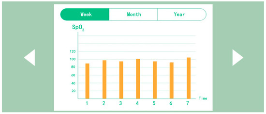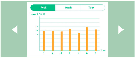 As shown in Figure 16, the test results presented originate from physiological feedback data collected from infants and toddlers in Nanjing. The left side is the home page of the mobile app interface, with a focus on the real-time display of physiological data. The physiological data displayed for blood oxygen saturation, heart rate, and body temperature are from half an hour following the commencement of the test (11:00 am). The blood oxygen saturation is 98%, the heart rate is 116 BPM, and the body temperature is 37 °C, which can be seen to be within the normal range, indicating that the monitoring sensor is working normally; the figure on the right is the data report generated after one week of testing. The researchers captured the enlarged data report from the mobile app, as shown in Figure 17. The data is shown as a yellow bar in the figure. The data from the seven-day period exhibits no abrupt warning indicators and demonstrates a relatively uniform pattern within the normal range. It should be noted that the daily data presented in this report represents the average value processed in the background, and therefore may not fully capture the occurrence of sudden conditions. Nevertheless, it offers significant insight into the long-term physiological status of infants and young children. (This issue will be elucidated subsequently).