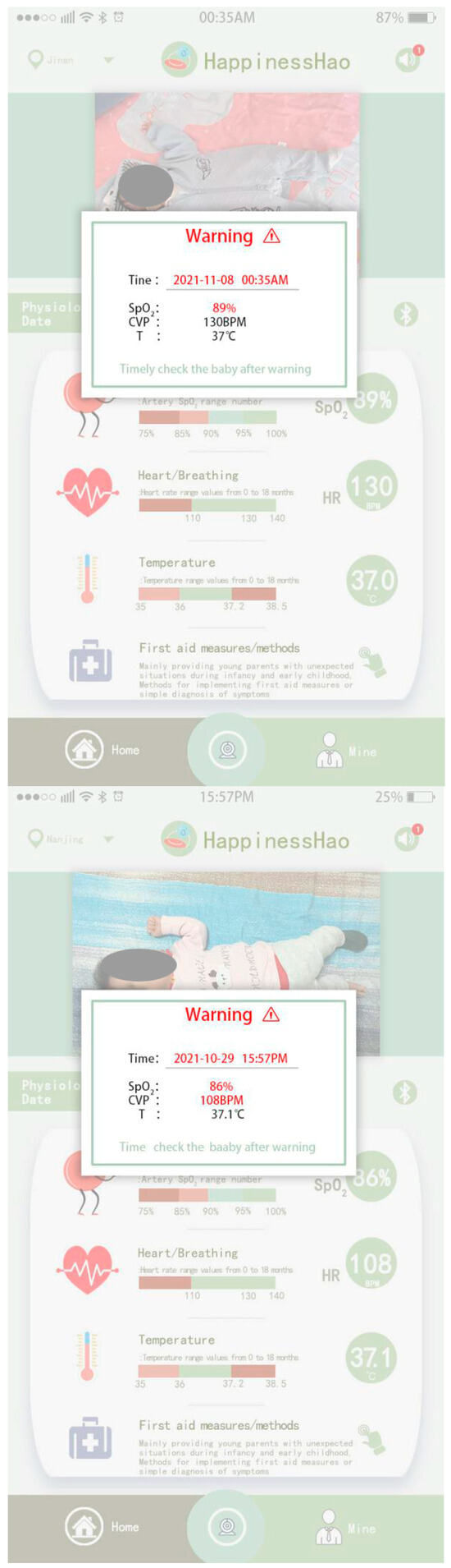 Functional test of infant anti-asphyxia socks—display of mobile app early warning information (part: from mobile phone screenshot).