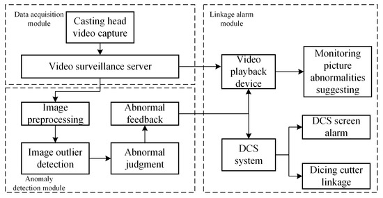 Figure 2. The main function of the data acquisition module is to collect picture data related to the melt of the pelletizer. These image data are usually obtained in real time by monitoring equipment and transmitted to other parts of the system for further processing and analysis. The anomaly detection module is responsible for analyzing the image data collected by the data acquisition module to detect whether there is an abnormality in the melt of the granulator. The main function of the linkage alarm module is to trigger the corresponding alarm mechanism when the abnormal melt of the granulator is detected and notify the relevant operator or system maintenance personnel to ensure that the abnormal situation can be detected and processed in time.