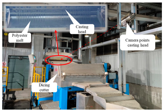 The image acquisition module is built using the existing video monitoring system of the pelletizer. The camera is installed in a slightly elevated position in front of the pelletizer, angled downwards towards the casting head, and capturing video of the melt extrusion and stretching process, with the data collection equipment setup being as shown in