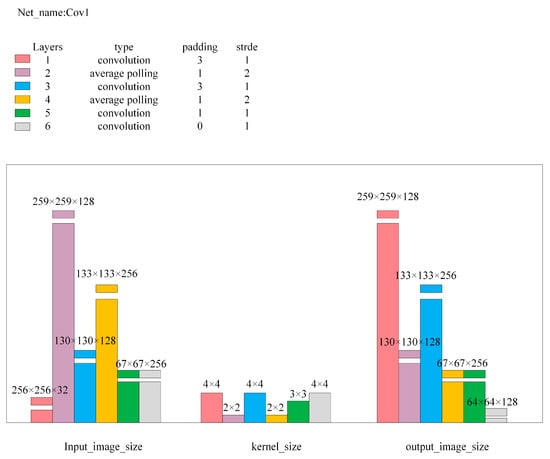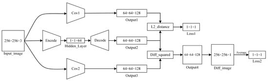Here, Input_image is the input image for the network; L2_distance is the Euclidean distance between Output1 and Output2, with Loss1 being its calculated value; Diff_squared is the squared difference image of images Output2 and Output3, outputting as Output4; and Diff_image is the anomaly value image obtained after dimension compression and bilinear interpolation magnification of Output4, with its pixel point average value as Loss2. Cov1, Cov2, Encode, and Decode are multi-layer convolutional neural networks, with the detailed network structure parameters being as shown in