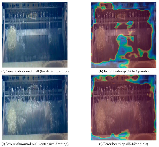 Figure 12f,h,j, although they all belong to melt anomalies, there are noticeable differences in the error images obtained by the AE network due to different degrees of anomalies, and the high-temperature areas are basically consistent with the actual anomaly areas, verifying the network’s localization ability. As the melt anomaly situation worsens, the “high-temperature” areas in the error heatmap continue to increase, and the calculated anomaly score Loss2 also continues to rise, showing a clear positive correlation, verifying the AE network’s ability to distinguish the severity of anomalies.