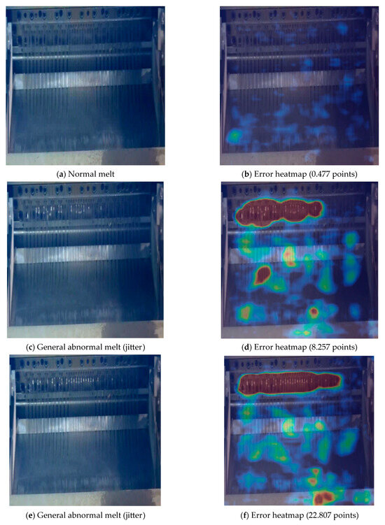 The contrast effect of the pelletizer melt from normal to severe anomalies is shown in Figure 12. The color of the area in the error heatmap represents the degree of anomaly in that area. The redder the area (the higher the temperature), the greater the reconstruction error of the AE network in that area, indicating a more severe anomaly. From the comparison of Figure 12b,d, it can be seen that for the highest anomaly value of normal melt images and the lowest anomaly value of general abnormal melt images, the AE network shows a significant difference in anomaly values, indicating a good distinction between “normal” and “abnormal”, with high sensitivity to melt anomalies. At the same time, the maximum anomaly value of the normal melt picture is only 0.477, indicating a small reconstruction error of the network.