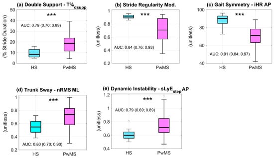 Statistically significant differences were found between HSs and PwMS in all five metrics (pMWt < 0.001). In particular, compared to HSs, PwMS showed longer double support phase, reduced gait regularity and symmetry, and increased dynamic instability and trunk sway (see Figure 2).