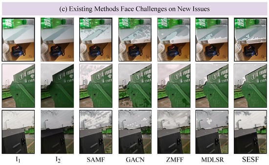 (a) Compared to the existing public datasets, the EDMF dataset not only has focus differences but also includes exposure differences. (b) The dataset disclosed in this paper has advantages in its scale and varying resolutions. (c) Taking the SAMF [17], GACN [19], ZMFF [20], MDLSR [21], and SESF [22] algorithms as an example, it is demonstrated that existing MFIF methods face the challenge of exposure difference.