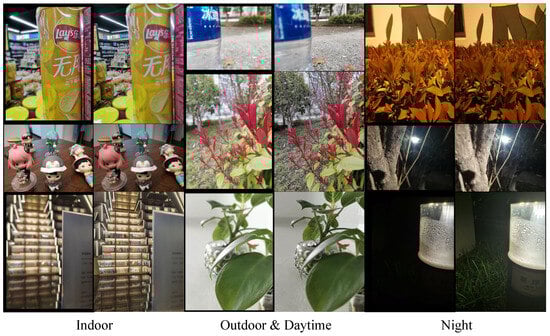 Scenes encompass diverse locations, including campuses, communities, roads, and both daytime and nighttime settings. In total, 1000 pairs of images were captured.