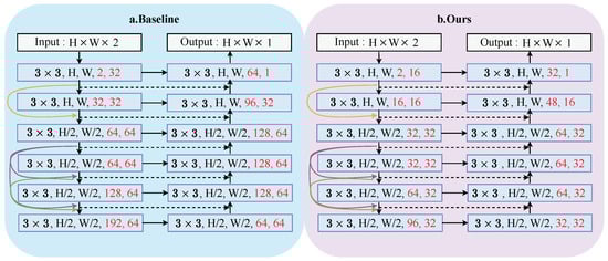 Specifically, the number of channels in the network is halved. This adjustment is made based on the analysis of experimental results. Figure 5 shows the network structure during our training. Figure 5a is the structure of the baseline (MUFusion). Figure 5b is the proposed network structure.