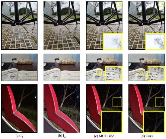 To highlight the differences in results between our method and the baseline (MUFusion), Figure 10 provides more examples of subjective comparisons. The fused images obtained by the training strategy refined in this paper are significantly better than MUFusion in terms of image texture details and clarity. In contrast, the proposed method demonstrated outstanding performance in qualitative assessment, indicating its superiority in handling complex exposure difference and maintaining image details. The fact that the SF value in Table 2 is much higher than that of MUFusion confirms this point.