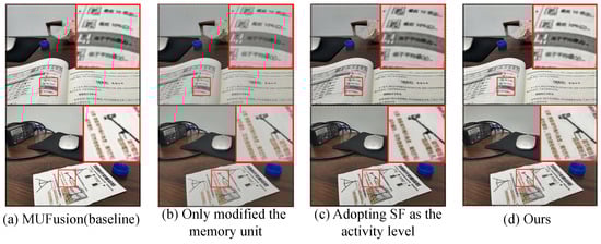 To validate the effectiveness of the proposed adaptive memory unit module and the spatial frequency-based activity level map, corresponding ablation experiments are conducted separately, as shown in Figure 13.