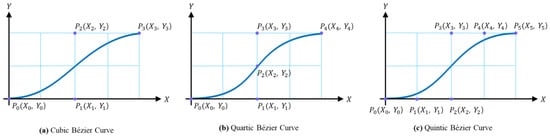 In the case of the quartic Bézier curve, there are three adjustable control points, and the resulting curve is shown in Figure 9a. The first and last control points follow Equation (10), while the remaining three control points are defined as follows: