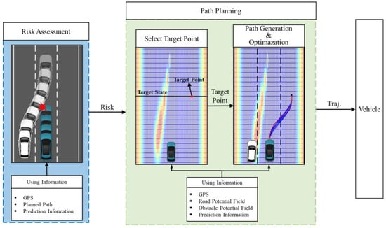 This study focuses on a path planning methodology that emphasizes the use of prediction information to avoid collisions with nearby vehicles. The study operates under the assumption that accurate prediction data is received, which is provided through pre-generated simulation data spanning approximately 2 s into the future with a time interval of 0.1 s. Although it is difficult to receive accurate prediction data in real-world without considering uncertainties, we believe that receiving the prediction data at the minimum time lengths makes it sufficiently understandable for the purpose of developing the path planning algorithm. This 2 s prediction horizon is commonly accepted as the minimum necessary time frame in trajectory prediction research, making it an ideal choice for our study. Architecture of the proposed methodology determines whether the avoidance path generation algorithm operates by conducting a collision assessment based on the predicted path of the surrounding vehicle and the planned path of the ego vehicle, as shown in Figure 2. When a collision with a surrounding vehicle is predicted, the APF identifies the point with the lowest potential value and designates it as the target point. A path for collision avoidance is then created using a quintic Bézier curve, optimized based on a cost function that considers factors such as curvature, total potential value, jerk, and the lateral offset from the current position to the target point.