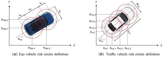 where represents the center point of the circle at time step on the ego vehicle’s planned path, denotes either the front or rear of the vehicle, represents the center point of the circle at the time step on the predicted path of the surrounding vehicle, and denotes the front, center, or rear of the vehicle. If the distance between the center points is smaller than the sum of the radii of the two circles, a collision is predicted. The parameters used to define the risk circle are provided in Table 1.