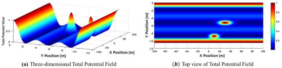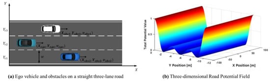 The road potential field is applied to represent a three-lane road, as illustrated in Figure 4a, using trigonometric functions. The potential field function is defined in Equation (8), and Figure 4b shows a 3D representation of the road potential field based on the following equation: