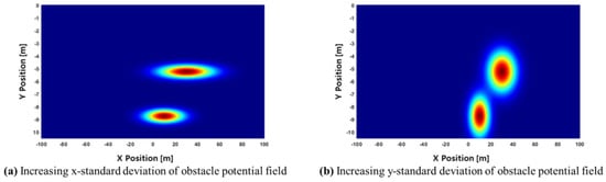 where is a small constant added to prevent computational errors when the speed of a surrounding object is the same as that of the ego vehicle; and are standard deviations in the longitudinal (x) and lateral (y) directions, respectively, affecting the size of the potential field. Figure 5 shows how the obstacle potential field changes based on different values of and .