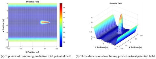 In this study, the future prediction is divided into five time steps, including the present and data from the next 2 s. Figure 7 shows an example of the top-down view and 3D visualization of the total potential field, combining both the obstacle and road potential fields, with the future position of the front vehicle located at [40, −5.25].