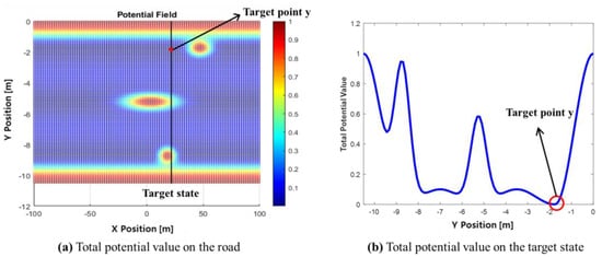 The APF is a path-planning algorithm that generates a virtual attractive potential field and a repulsive potential field to guide a vehicle to its target. In this study, we consider the surrounding environment by constructing a suitable potential function that creates a road potential field (considering the lanes boundaries) and an obstacle potential field (considering static or moving obstacles). Traditional APF designs an attractive potential field to lead the vehicle toward the goal, but in the proposed method, we eliminate the attractive potential field. Instead, we designate the point with the lowest potential value as the target point in APF. The road potential field is used to keep the vehicle in the center of the lane, preventing it from veering off-road, while the obstacle potential field ensures the vehicles avoid collisions with obstacles. The combined values of these two potential fields are represented as follows: