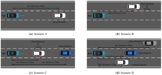 The proposed methodology aims to use prediction information from surrounding traffic to efficiently and stably avoid collision. We evaluate this methodology by comparing scenario results with and without the prediction information, as well as using quartic and quintic Bézier curves. Four test scenarios are used to evaluate the methodology. Scenarios A to C are based on autonomous systems test scenarios defined by ISO DIS 34502 [45], as shown in Figure 10, and Scenario D is a test scenario for continuous avoidance behavior. Scenarios A to C run for 13 s, while Scenario D runs for 15 s. The specifications of each scenario will be described at the beginning of each experiment’s results section. The collision avoidance path algorithm is triggered based on a TTC threshold of less than 2 s when prediction information is not used in order to allow comparison with the system that utilizes prediction information.