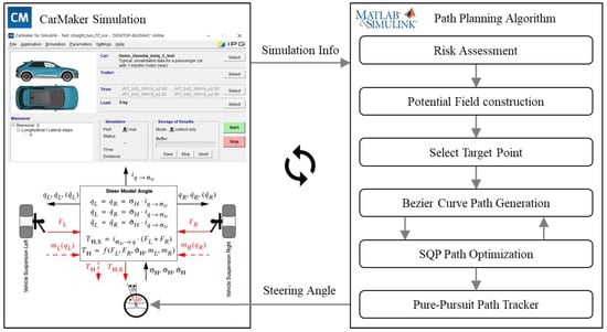 To validate the proposed avoidance path generation methodology, an integrated environment, as shown in Figure 11, is set up using IPG’s software, CarMaker. The driving road information, surrounding vehicle data, and perception results used in the avoidance path generation algorithm are provided by CarMaker. When a collision is predicted during the ego vehicle’s driving, the proposed algorithm plans the optimal avoidance path. This planned path is then passed to the pure pursuit lateral controller, where the steering angle is calculated and subsequently transmitted to the CarMaker vehicle model. This integrated environment is configured using IPG CarMaker version 12.0.1 and MATLAB 2022b/Simulink, ensuring smooth integration and compatibility with other software.
