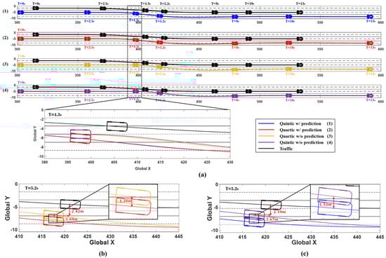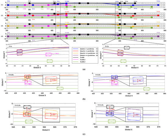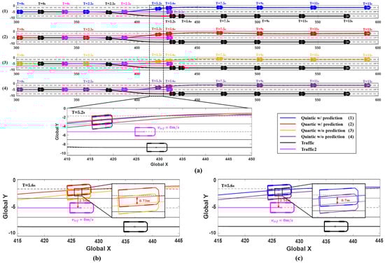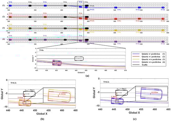 Simulation results for Scenario A. (a) Vehicle trajectories and time series vehicles position (0, 3, 6, 6.5, 9, 11, and 13 s). (b) Comparison of 6.5 s trajectories: Quartic w/prediction (red) vs. w/o prediction (yellow). (c) Comparison of 6.5 s trajectories: Quintic w/prediction (blue) vs. w/o prediction (purple).