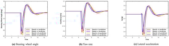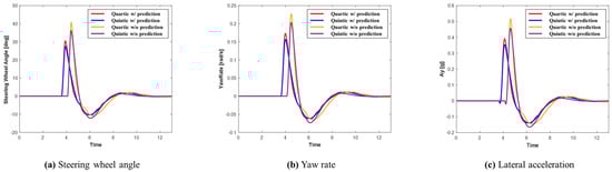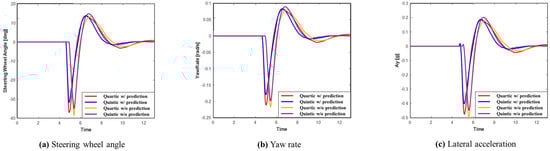 The simulation results are shown in Figure 12 and Figure 13, illustrating the driving situations at 0, 3, 6, 6.5, 9, 11, and 13 s, depending on whether the prediction is utilized and whether the quartic or quintic Bézier curve algorithm is applied. The results include changes in the ego vehicle’s steering wheel angle, yaw rate, and lateral acceleration over time. Figure 12 shows the driving trajectories at each time interval, confirming that the system utilizing prediction started avoidance earlier. At 6 s, the driving paths of the system with prediction, represented in red and blue, secured more lateral distance from the traffic vehicle compared to the paths of the system without prediction, shown in yellow and purple. Figure 12b illustrates the driving situation at 6.5 s in Scenario A, where the red trajectory represents the use of prediction with the quartic Bézier algorithm, while the yellow trajectory shows the result without prediction. At this point, using prediction allowed the system to begin avoidance earlier, achieving 0.363 m more lateral distance compared to the system without prediction. The quartic Bézier algorithm, without prediction, measured a lateral distance of 3.01 m from the traffic. Similarly, the blue path in Figure 12c represents the quintic Bézier algorithm with prediction, which achieved 0.235 m more lateral distance compared to the algorithm without prediction, which measured 2.96 m from the traffic.
