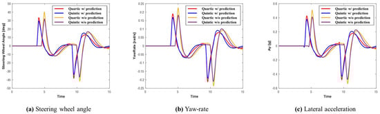 Figure 15 presents the graphs illustrating the steering wheel angle, yaw rate, and lateral acceleration for each system in Scenario B. From the graphs, it is clear that the system incorporating prediction generated a smoother path and achieved greater lateral stability. Additionally, the quintic Bézier curve demonstrated more stable lateral performance than the quartic Bézier curve. As detailed in Table 5, since Scenario B involves a more abrupt maneuver than Scenario A, the maximum values for lateral acceleration, yaw rate, and steering wheel angle are higher. However, the system with prediction consistently recorded smaller maximum values than the system without prediction. Furthermore, comparing the two algorithms, the quintic Bézier algorithm consistently resulted in smaller maximum values than the quartic Bézier algorithm. For instance, the highest recorded lateral acceleration in Scenario B was 0.5574 g, the yaw rate was 0.2429 deg/s, and the steering wheel angle pealed at 44.6627 deg, all of which occurred when using the quartic Bézier algorithm without prediction.