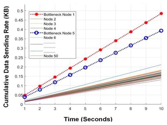 Simulation starts with the communication of data among the sensor nodes. Figure 3 shows the data-sending rate of the bottleneck and other nodes as well.