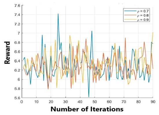 Data communication within the network consumes a significant amount of energy. Hence, an increase in data transmission leads to an increase in energy consumption, which in turn reduces the remaining energy even below the threshold value, . As soon as the remaining energy of any bottleneck node reaches , this node switches to the z phase and recharges its battery via the WPCD on a priority basis to remain operational forever. The WPCD transmits power to the nodes of the z phase first. We validated the results with the help of a Monte Carlo simulation, where c is the mean distance matrices of the nodes. The proposed optimum path for WPCD-ACO is implemented through the influential behavior of ant colony optimization satisfying the z phase effect for drifting the WPCD. Hence, the reward function of the WPCD-ACO algorithm is tested at different values of . Figure 4 shows that is formulating the best reward for the ant’s behavior in the WPCD-ACO algorithm.