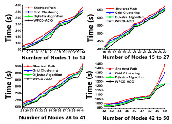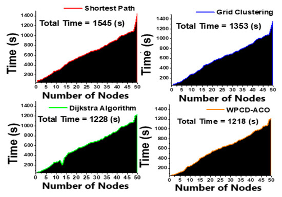 The proposed method calculates the total travel time by comparing it with the shortest path, grid clustering, and Dijkstra algorithm. Figure 6 clearly states that the proposed methodology has less travel time than the other equivalent literature. The lower traveling time in the field enables the WPCD to spend more time at the rest station for its vacation.