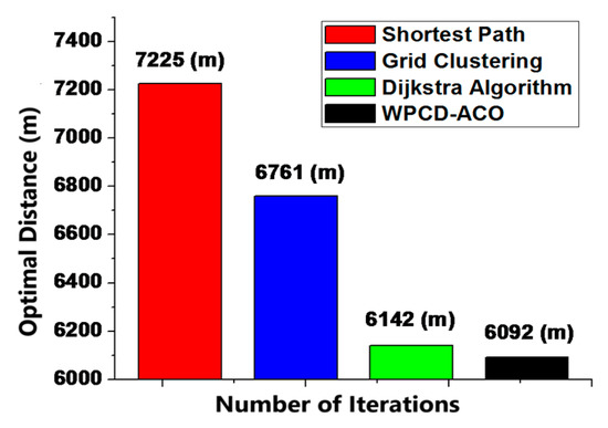 Likewise, one of the core objectives of the proposed scenario is to decrease the travel distance of the WPCD in the field. Figure 7 illustrates that the outage optimal distance measured by the proposed WPCD-ACO method is 6092 m as compared to 7225 m in the case of the shortest path, 6761 m in the case of grid clustering, and 6142 m in the case of Dijikstra’s algorithm, respectively [19,21].