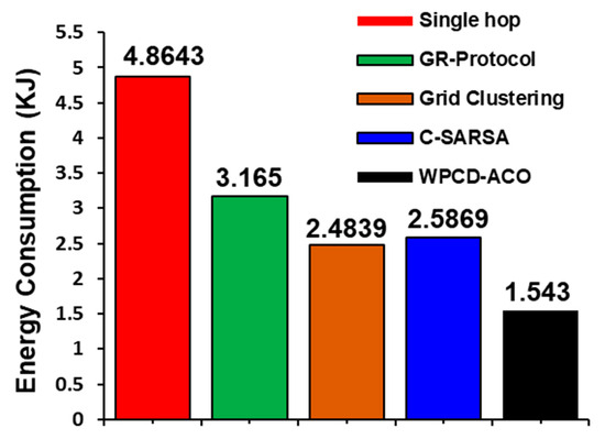The grid clustering tactic, as presented in [19], comprises a wireless charging device to supplement the power of sensor nodes. This approach effectively increases the network lifetime and significantly reduces its energy consumption. Other research in [19,22] also introduces the wireless power transmission approach to save the network’s lifetime. The comparative scrutiny of Figure 8 displays that our methodology conserves energy more efficiently than the others. The energy consumption is almost 50 percent lower than previous approaches. Quantitatively, the energy consumption for a single hop is 4.8643 KJ while GR-Protocol has 3.165 KJ, Grid clustering has 2.4839 KJ, C-SARSA has 2.5869 KJ, and the proposed WPCD-ACO has 1.543 KJ, correspondingly.