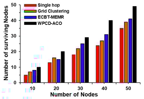 Finally, to validate the superiority of our proposed WPCD-ACO, we have compared our work with that of [33]. In line with the fundamental objective of the WPCD-ACO methodology, bottleneck nodes are being recharged on a priority basis. Therefore, the survival rate of the nodes is almost 99 percent in the entire network. In contrast, ECBT-MEMR has a lower number of surviving nodes as compared to WPCD-ACO at a different number of deployed nodes as shown in Figure 9.