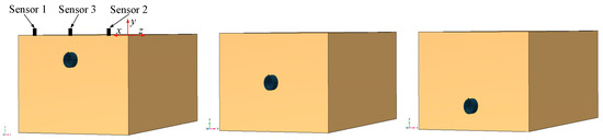 In this study, the proposed method for determining the lateral position and vertical depth of the pipeline based on delay time τ is validated using COMSOL Multiphysics 6.1. First, a model of a polyethylene (PE) pipeline with dimensions L = 1.5 m, r = 0.045 m, and h = 0.085 m is established in COMSOL. Sensors 1, 2, and 3 are positioned above the pipeline on the soil surface, with sensor 3 located at the midpoint between sensors 1 and 2. The burial depths of the pipeline are set at 10 cm, 20 cm, and 30 cm, as illustrated in Figure 2. The material parameters for the pipeline and soil are provided in Table 1. The axial position of the pipeline is determined by examining whether there is a delay time corresponding to the peak values of the time-domain signals received by sensors 1 and 2. By adjusting the positions of sensors 1 and 2, when the delay time is zero, it can be inferred that the pipeline is located between the two sensors. Subsequently, the vertical depth of the pipeline is determined by constructing an elliptical equation based on the previously discussed theory and calculating the depth of the pipeline using the delay time between sensors 2 and 3.