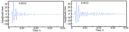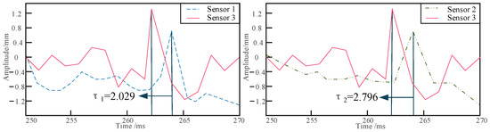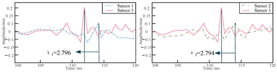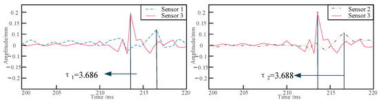 The pipeline is excited using a Rayleigh wave, and the first step is to determine its lateral position. As shown in Figure 3, for a burial depth of 10 cm, the peak times of the signals collected by sensors 1 and 2 during the first experimental set are presented. When the time difference between sensors 1 and 2, denoted as the delay time , is equal to zero, it confirms that sensor 3 is positioned directly above the pipeline. Subsequently, the excitation signals from sensors 2 and 3 are extracted to obtain their delay time . As illustrated in Figure 4, for a burial depth of 10 cm, the positions of sensors 2 and 3 are 30 cm apart, and the distance from the excitation point to the sensors is 1 m, from which the peak times of the two signals are recorded.