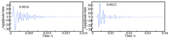 As illustrated in Figure 4, the signals extracted from sensors 2 and 3 exhibit a delay time , which is calculated to be 0.0016 s. Using Equation (14), the depth of the pipeline is determined to be 10.24 cm, resulting in an error of 2.4% compared to the actual burial depth. Subsequently, simulations are conducted for burial depths of 20 cm and 30 cm, with sensor distances from the excitation point set at 0.5 m, 1 m, and 1.5 m, and the sensor arrangements located 10 cm, 20 cm, and 30 cm from the center position. After obtaining the delay times for the buried polyethylene pipeline, the depths of the pipeline are calculated using Equation (14). The discrepancies between the calculated burial depths of the PE pipeline and the theoretical values are summarized in Table 3, Table 4 and Table 5.