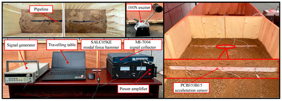 Based on the theoretical and simulation foundations discussed earlier, a laboratory experiment was conducted on the pipeline. As shown in Figure 5, the experimental setup includes an MI-7004 signal acquisition system, an SALC05KE modal hammer (Yiheng Technology Co., LTD. Hangzhou, China), three PCB353B15 accelerometers (PCB Piezotronics, Inc. Buffalo, NY, USA), a movable workbench, a conduction plate, a 100 N shaker, a signal generator, and a power amplifier. A polyethylene pipeline with a length of 3.2 m is embedded in a rectangular box measuring 3 m in length, 1 m in width, and 1 m in height, at burial depths of 10 cm, 20 cm, and 30 cm. The 100 N shaker is positioned on the side of the extending PE pipeline to provide excitation, while three sensors are arranged directly above the pipeline via the conduction plate to capture the excitation acoustic waves. The software testing environment is configured as follows: (I) a frequency range of 0–5000 Hz, (II) Hamming window applied, and (III) frequency resolution set to 1 Hz.