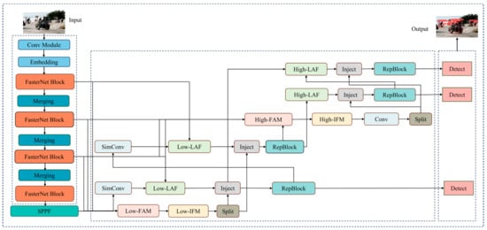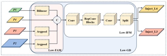 The alignment feature then generates global information through low-stage IFM (Low-IFM). Low-IFM includes multi-layer reparameterized convolution blocks (RepBlock), convolution operation at input and output, and finally split operation. The global features are generated by using as an input through RepBlock and then they are divided into and in the channel dimension for fusion with features at different levels. The expression is as follows: