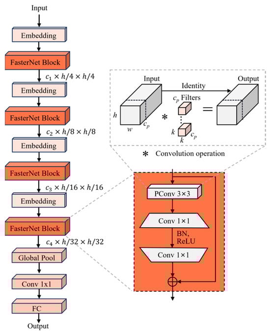 For , PConv’s memory access is only one-fourth that of a regular convolution. In addition, batch normalization (BN) [32] is chosen for FasterNet because BN can be merged with the adjacent convolution layer to achieve faster inference while preserving the effect. GELU [33] is chosen for the activation layer.