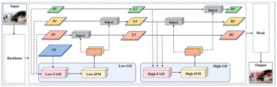 The GD module consists of three key components: feature alignment module (FAM), information-fusion module (IFM), and information injection module (IIM). FAM is responsible for collecting and aligning features from different levels to ensure that feature maps at different levels are properly grouped together in subsequent processing. IFM further incorporates these features to produce global context information. This step helps capture multi-scale features. IIM distributes the global information generated by IFM to each level and injects it into the corresponding branches with simple attention operations to enhance detection capabilities. Meanwhile, low-stage GD (Low-GD) branch and high-stage GD (High-GD) branch are introduced to detect pedestrians at different scales. The improved structure of the neck is shown in Figure 3.