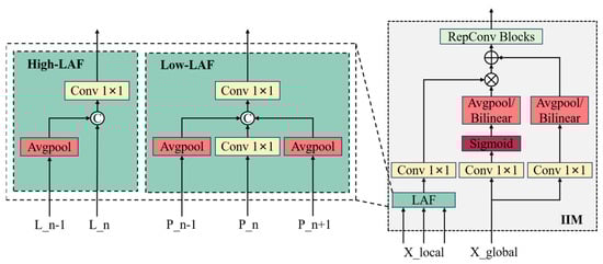 The global information is gathered through FAM and IFM and then the obtained global information is injected into different levels through IIM, as illustrated in Figure 5. IIM combined with lightweight adjacent layer fusion (LAF) increases the number of information flow paths between different levels by simplifying operations, thus improving performance without significantly increasing latency. The LAF module contains Low-LAF and High-LAF, which are used for low-level injection and high-level injection, respectively. Specifically, local information input into the module is processed by LAF and 1 × 1 convolutional layer. The global injection information is processed by two different convolutional layers to obtain and . The expression for the operation is as follows: